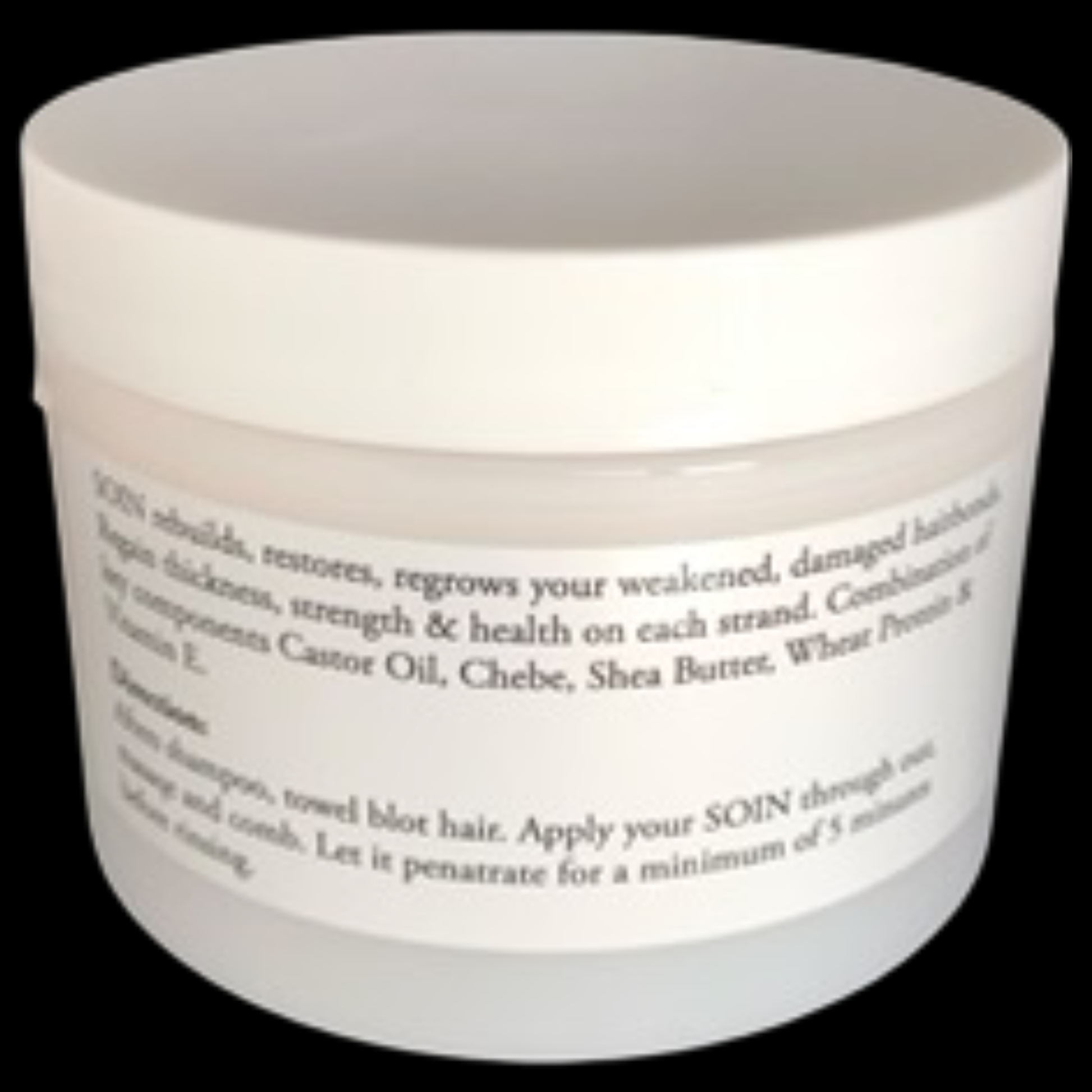 Ingredients: De-ionized Water, Glycerin, Cetyl Alcohol, Stearalkonium Chloride, Behentrimonium, Methosulfate, Cetearyl Alcohol, Croton Zambesicus (Chebe) Powder, Stearyl Alcohol, Agania Spinosa (Argan Oil), Hydrolyzed Wheat Protein, Hydrolyzed Wheat Starch, Silk Amino Acids, Butyrospermum Parkii (Shea Butter), Aloe Barbadensis, Olea Europea (Olive) Fruit Oil, Panthenol, Vitamin E (Tocopheryl Acetate), Ricinus communis (Castor) Oil, Glycine Max (soy) Oil, Mel (Honey) Powder, Jamaican Black Castor Seed Oil, Vitis Vinifera (Grapeseed) Oil, Daucus Carota (Carrot) Oil, Mentha Piperita (Peppermint) Oil, Rosmarinus officinalis (Rosemary) oil, Zinc, Sulfur, Capiscum Frutescens, Tocopheryl Acetate (Vitamin E), Biotin, Niacin, Phenoxyethanol, Fragrance.